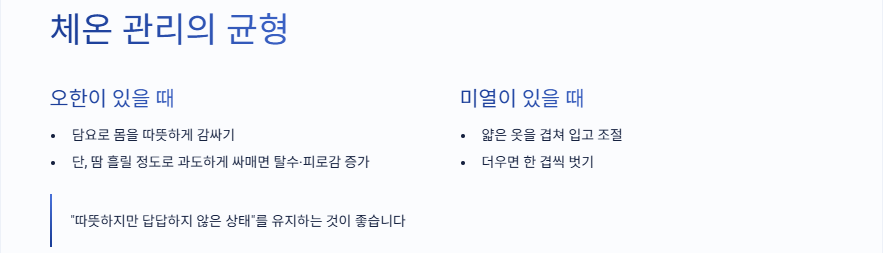 • 충분한 휴식, 따뜻한 수분, 소화 잘 되는 식사, 적당한 체온·습도 관리가
