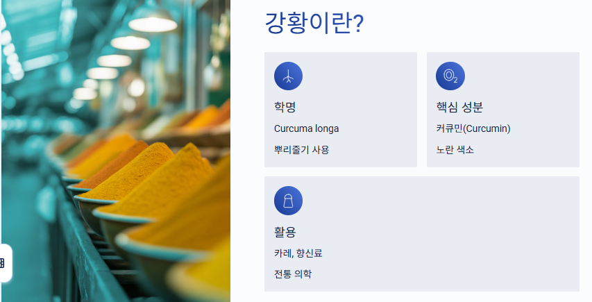 • 대표 성분: 커큐민(curcumin) – 노란 색소이자 강황의 핵심 유효 성분