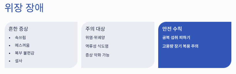 • 위장 자극: 속쓰림, 메스꺼움, 설사 등