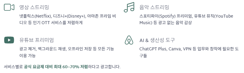 최대 60~70% 저렴하게 쓸 수 있다는 점이 가장 큰 강점입니다. - 여러 OTT·음악·AI 서비스를 동시에 이용하는 사람이라면
