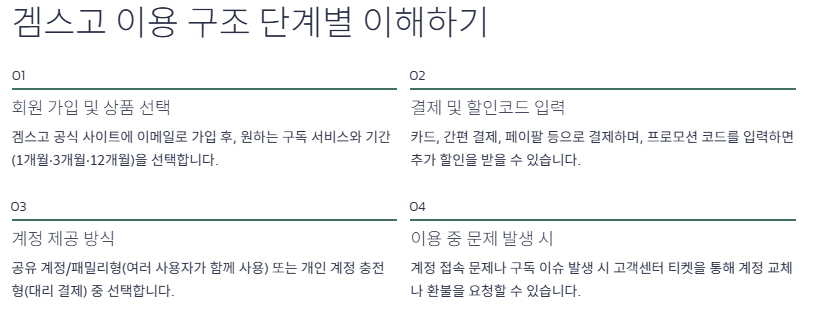 공식 사이트에서는 “여러 사용자가 하나의 구독을 나눠 쓰는 공유경제형 모델”이라고 소개하고 있습니다. GamsGo+1