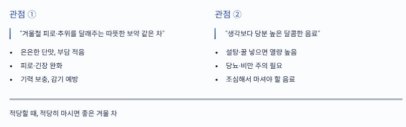 관점 ① “겨울철 피로·추위를 달래주는 따뜻한 보약 같은 차”