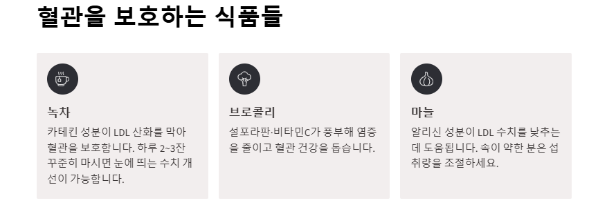 혈관 염증이 함께 쌓이며 심혈관 위험이 커지기 때문에, 항염·항산화 효과가 있는 음식도 꼭 필요합니다.