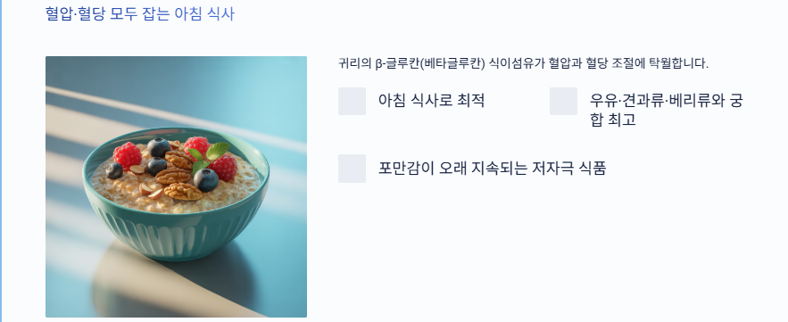 귀리는 **β-글루칸(베타글루칸)**이라는 식이섬유가 풍부해 혈압과 혈당 조절에 탁월합니다.