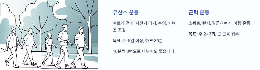 - 빠르게 걷기, 자전거 타기, 수영, 가벼운 조깅 등