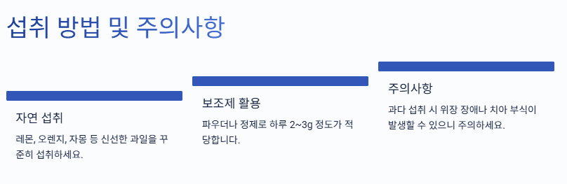 - 단기간 ‘기적의 성분’이라기보다, 일상 속에서 레몬워터, 과일 섭취, 적정량 보충제를 통해 꾸준히 관리할 때 가장 큰 가치를 발휘합니다.