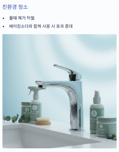 구연산은 물때 제거에 탁월하며, 베이킹소다와 함께 사용하면 친환경 청소 솔루션으로 매우 효과적입니다.