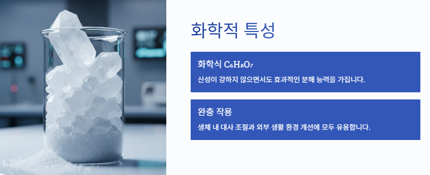 구연산(C₆H₈O₇)은 산성이 강하지 않으면서도 효과적인 분해·완충 기능을 가지고 있어, 생체 내 대사와 외부 생활 환경 개선에 모두 유용합니다.
