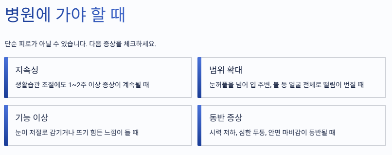 다만, 오랫동안 지속되거나 떨림 강도가 강해지는 경우에는 단순 피로가 아닌 다른 문제일 가능성도 있기 때문에, 이런 구분이 중요합니다.