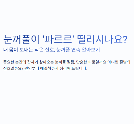 - ‘눈꺼풀 떨림 원인’, ‘눈꺼풀 떨림 멈추는 법’, ‘눈꺼풀 떨림 병원’ 같은 키워드를 중간중간 자연스럽게 넣어 주시면