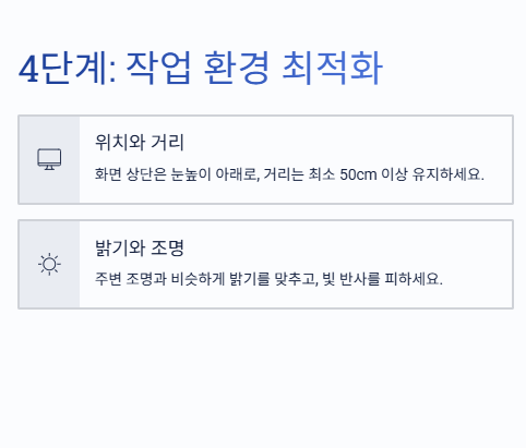 이제 눈 피로를 줄이기 위해 당장 할 수 있는 실천 방법을 단계별로 정리해보겠습니다.