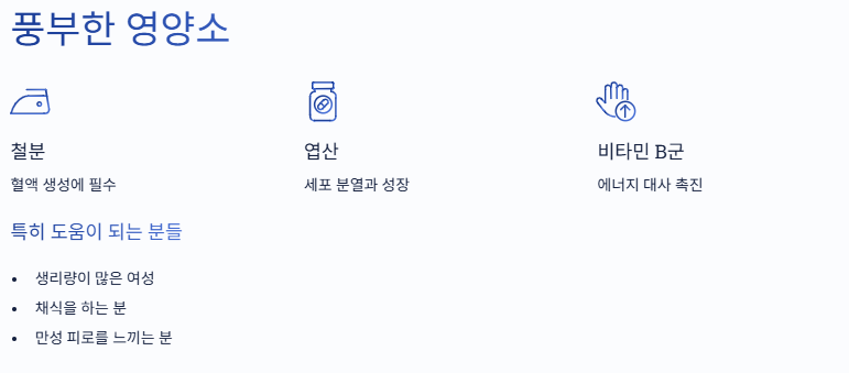 - 철분, 엽산, 비타민 B군 등이 풍부합니다.