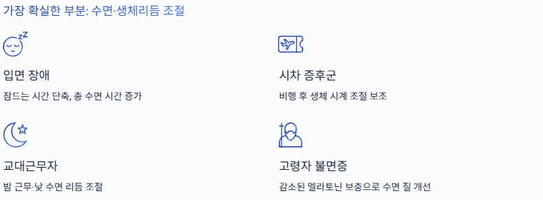 - 입면 시간 단축, 시차 적응, 교대근무 수면 문제, 일부 고령자 불면 등에