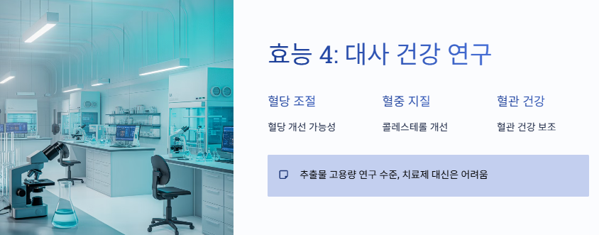 - 기타 연구 → 혈당·혈중 지질 등 대사 건강에 긍정적 영향 가능성(보조적 차원)