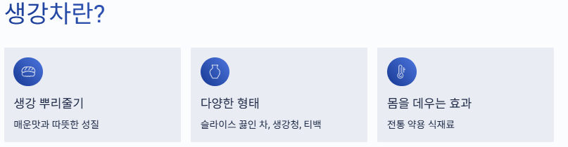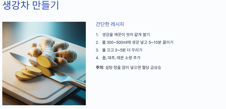 - 형태: 생강 슬라이스를 끓인 차, 생강청(생강+설탕/꿀) 희석, 티백 등