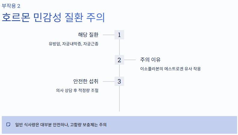 이소플라본 과다 섭취가 부담이 될 수 있다는 우려도 있습니다. - 이런 분들은 반드시 주치의와 상의 후 섭취량을 조절하는 것이 안전합니다.