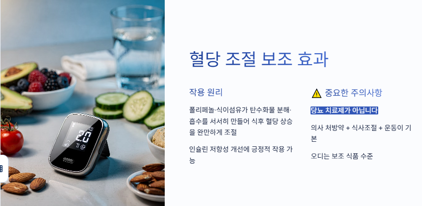 혈당이 급격히 치솟는 것을 완화하는 데 일부 기여할 수 있음 - 인슐린 저항성 개선에 긍정적으로 작용했다는 동물·소규모 연구들도 보고