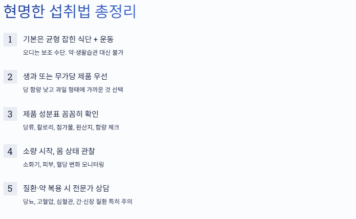 - **당 함량(첨가당 여부)**을 반드시 확인해야 합니다.