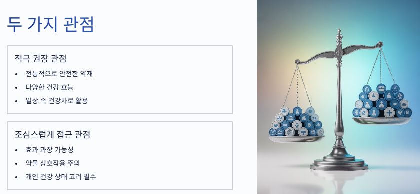 - 위장 장애, 약물 상호작용 가능성 등을 가진 ‘기능성 있는 약재’에 가까운 존재