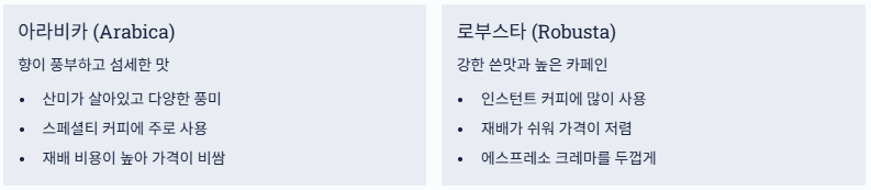 - 품종: 아라비카(향·산미·섬세함) vs 로부스타(쓴맛·카페인·저렴함)