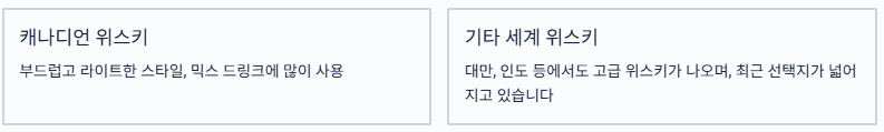 • 캐나디언 위스키: 부드럽고 라이트한 스타일, 믹스 드링크에 많이 사용