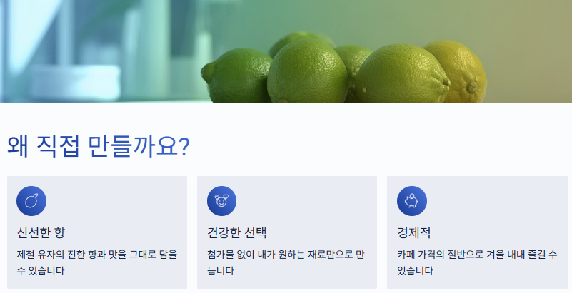 - 유자에이드: 탄산수 + 얼음 + 유자청 2스푼.