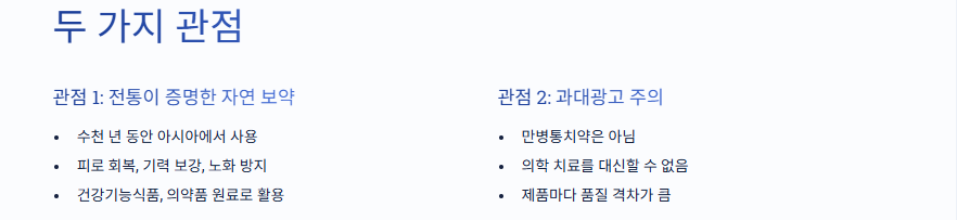 과학적 근거가 부족하거나 과장된 경우가 많음 - 인삼류도 결국 **‘보조적인 건강관리 수단’**이지,