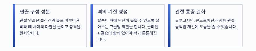 - 즉, 콜라겐 + 칼슘이 함께 있어야 뼈가 튼튼해지는 구조입니다.