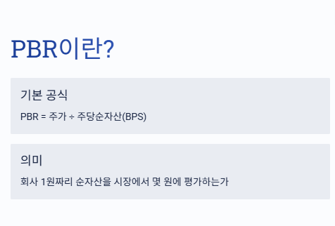 PBR = 주가 / 주당순자산(BPS) 를 의미합니다.